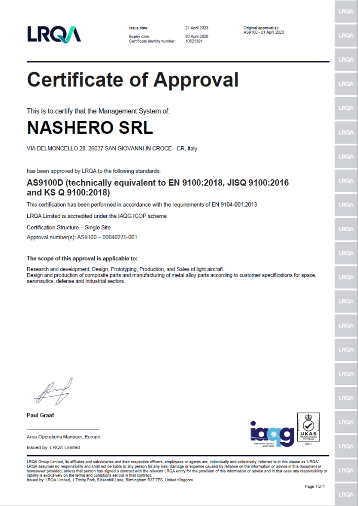 Lloyds has approved NASHERO in its entire scope of work for having met the quality requirements of the AS9100 aerospace standard.